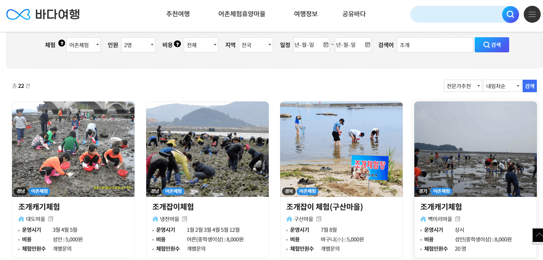 조개잡이 체험 어디서 할 수 있는지 한 번에 볼 수 있는 사이트가 있어 함께 공유할게요. 바다여행 사이트인데요 어촌체험마을 - 체험에서 조개라고 검색하시면 다양한 조개잡이 체험을 검색할 수 있어요. 조개잡이 체험 어디에서 할 수 있나 검색하신다면 한번 방문해 보세요.