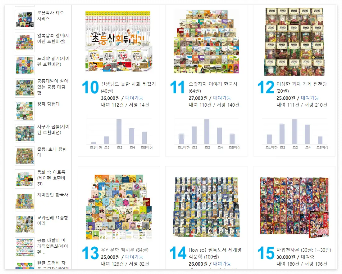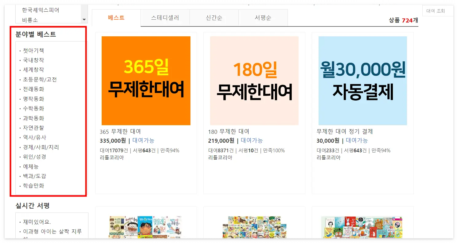 이렇게 분야별로 볼 수도 있어요. 첫아기책부터 국내창작, 수학동화, 과학동화, 위인까지 분야별로 전집을 대여해서 사기 부담스러운 책을 대여로 마음껏 읽게 할 수 있는 점이 좋더라고요.