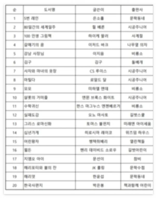 5학년 추천 도서 20 리스트 다운로드 및 리틀 코리아 책 대여