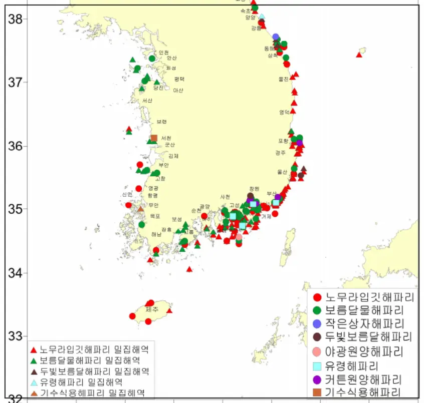 이렇게 어느 곳에 어떤 해파리가 출몰하고 있는지 보여주고 있어요.