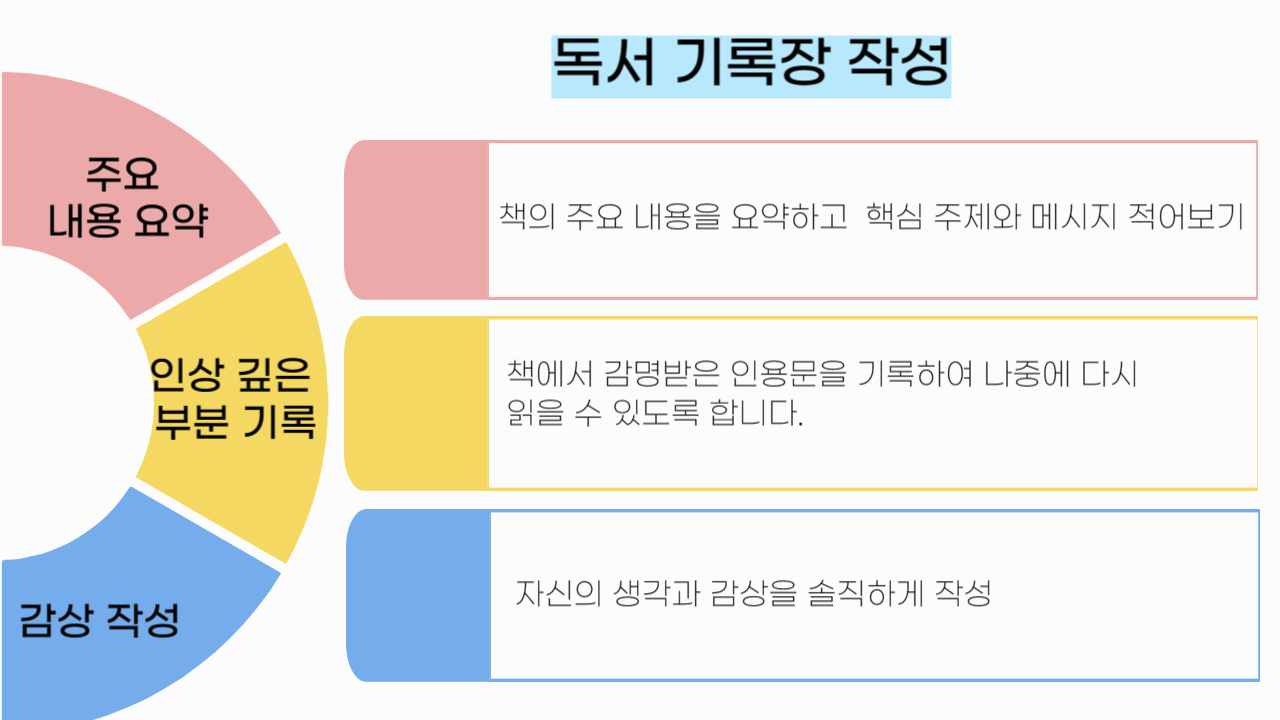 효과적인 독서 기록 방법은 주요 내용 요약, 인상 깊은 부분 적기, 나의 감상 이렇게 세 가지 정도 기록할 수 있어요.
