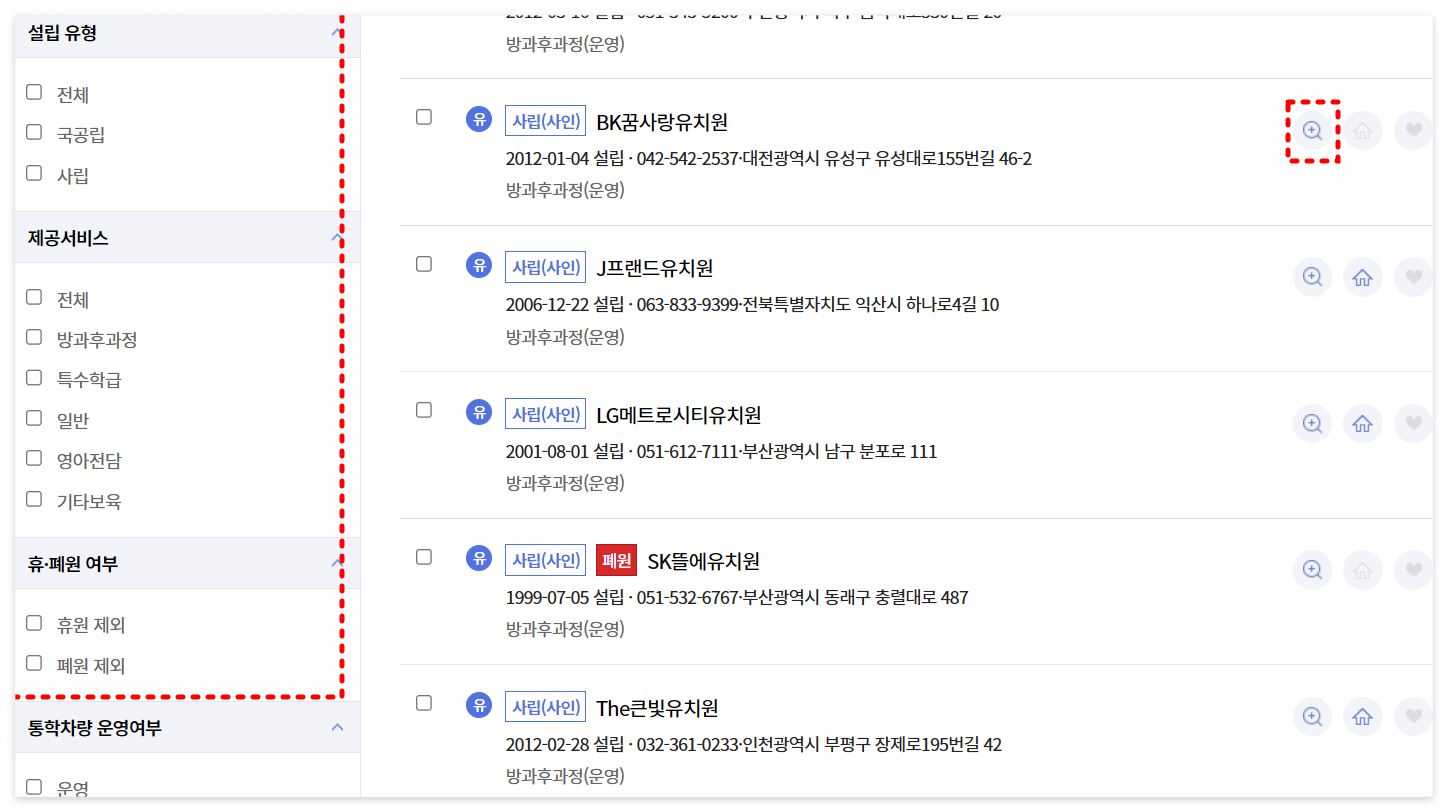 유치원 어린이집 정보 > 유치원 어린이집 조회에서 하트로 선택 후 유치원 어린이집 비교 클릭하기!