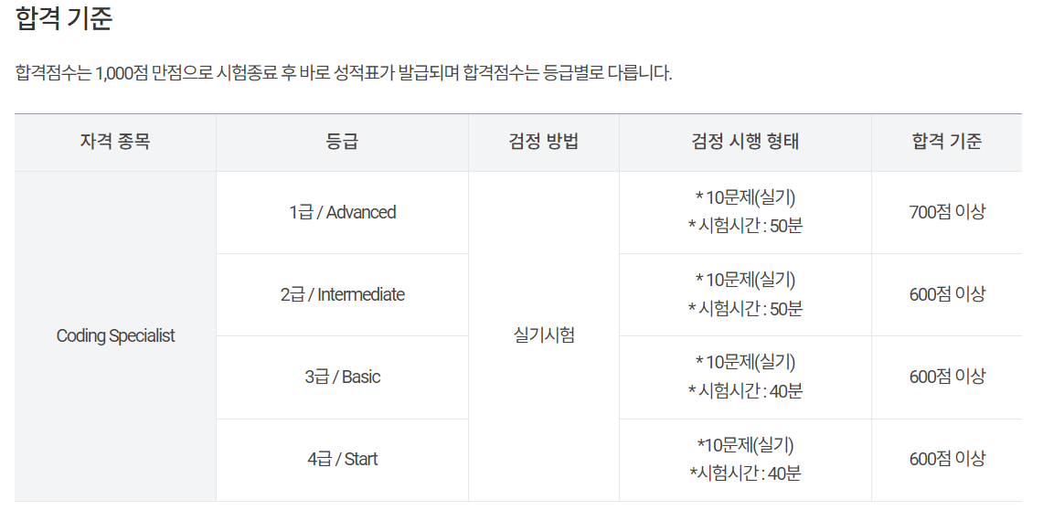 - 총 10문제 실기 진행 / 급수별 시험 시간 상이 / 합격점수가 등급별로 다름