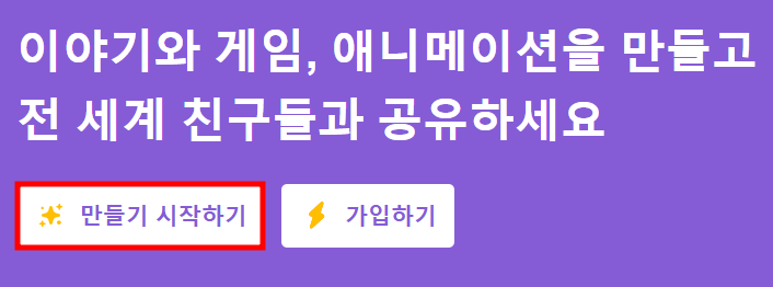 먼저 스크래치 사이트에서 만들기를 선택하여 스크래치 코딩 에디터 화면으로 들어가요. 아래 만들기 시작하기로 빠르게 실행하세요.