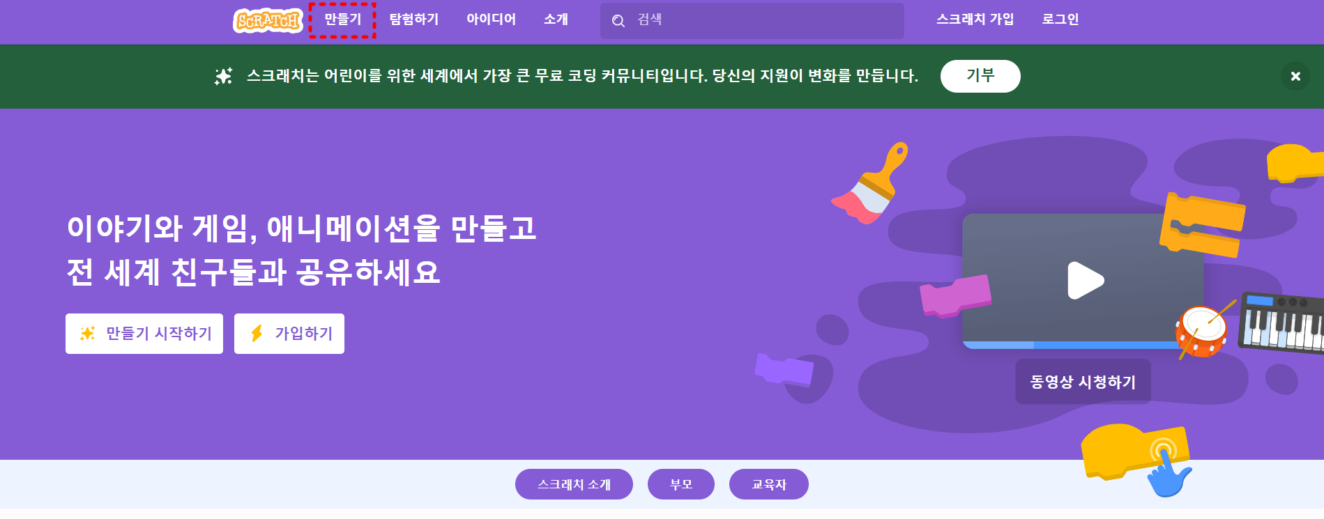 먼저 스크래치 사이트에서 만들기를 선택하여 스크래치 코딩 에디터 화면으로 들어가요. 아래 만들기 시작하기로 빠르게 실행하세요.