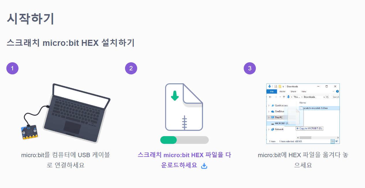 다음은 hex파일을 마이크로비트에 다운로드해야 해요. 그대로 스크롤 화면을 내리면 다음과 같은 화면이 떠요. hex파일 다운로드 순서까지 친절하게 설명해 줘요.