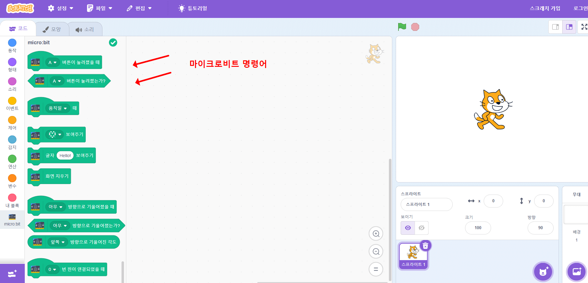 아래와 같이 마이크로비트 명령어가 생기셨나요? 그럼 성공입니다.