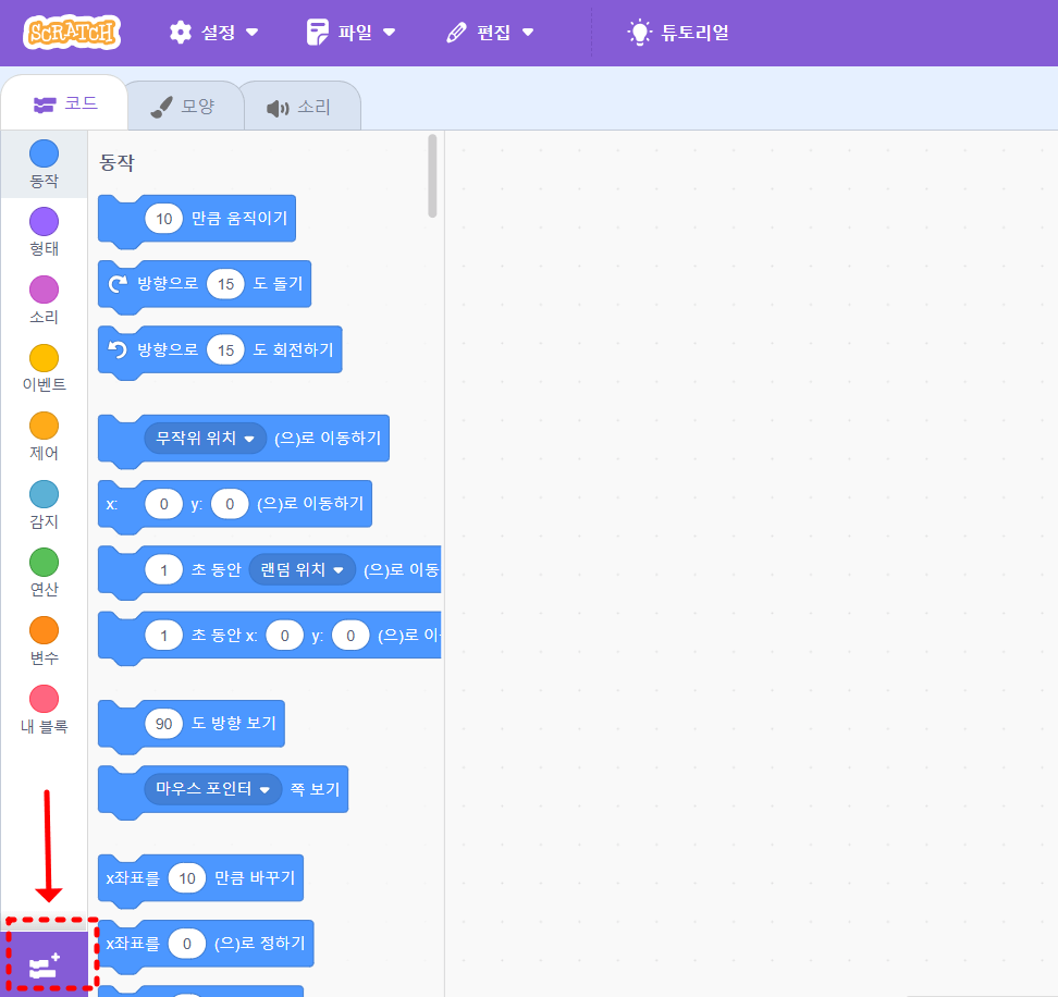 스크래치 에디터 화면의 왼쪽 아래에 보면 아래와 같이 플러스 표시가 있어요. 바로 스크래치 확장 기능을 사용할 수 있는 메뉴입니다.