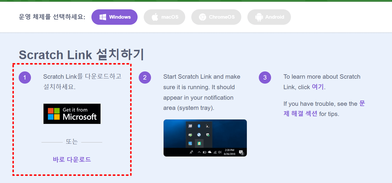 상태표시줄에 아래와 같이 Scratch Link가 실행 중인 상태면 설치 완료입니다.