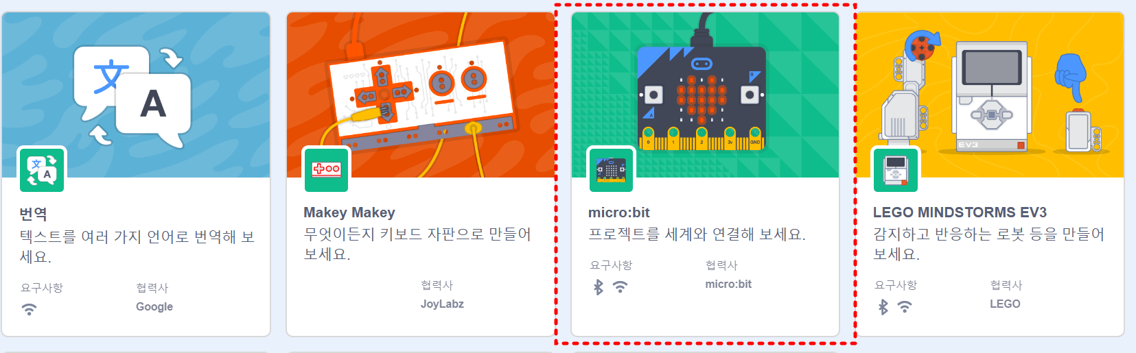다양한 확장기능 중에서 micro:bit를 선택하시면 돼요.